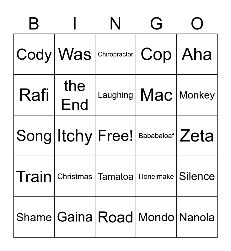 This bingo card has a free space and 54 words: Moon, Train, Judy, Barbie, Tamatoa, Bear, Cop, STX, Rafi, Bridge, Cody, G, Gaina, Shame, Zowenon, Road, Nanola, Mac, Cough, Zeta, Honeimake, Bardeyoo, Bababaloaf, Aha, Bonoboxing, Was, A, Hot, Lemiw, Mondo, Crying, Gaty, Sally, Buhihozelir, Chiropractor, Hot (again), Song, Silence, Aah, the End, Sausage, Dream, Look at Me, Gift, Christmas, 8, Sonic, 1-0, Laughing, Itchy, Monkey, Plug, O and Rawr.