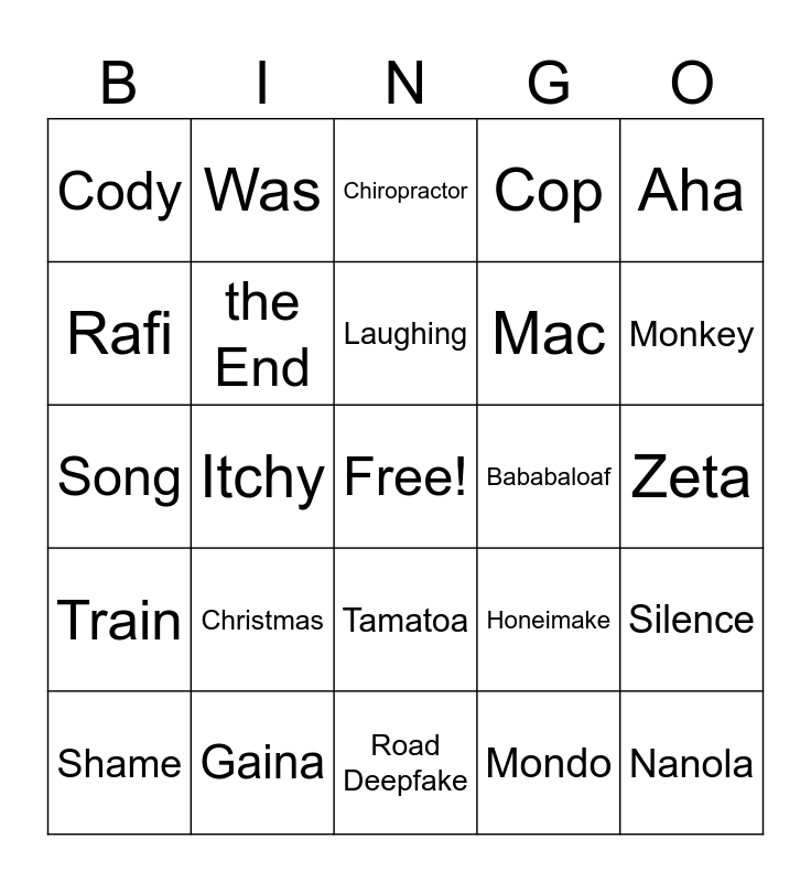 This bingo card has a free space and 54 words: Moon, Train, Judy, Barbie, Tamatoa, Bear, Cop, STX, Rafi, Bridge, Cody, G Sad, Gaina, Shame, Zowenon, Road Deepfake, Nanola, Mac, Cough, Zeta, Honeimake, Bardeyoo, Bababaloaf, Aha, Bonoboxing, Was, A, Hot, Lemiw, Mondo, Crying, Gaty, Sally, Buhihozelir, Chiropractor, Hot (again), Song, Silence, Aah, the End, Sausage, Dream, Look at Me, Gift, Christmas, 8, Sonic, 1-0, Laughing, Itchy, Monkey, Plug, O and Rawr.