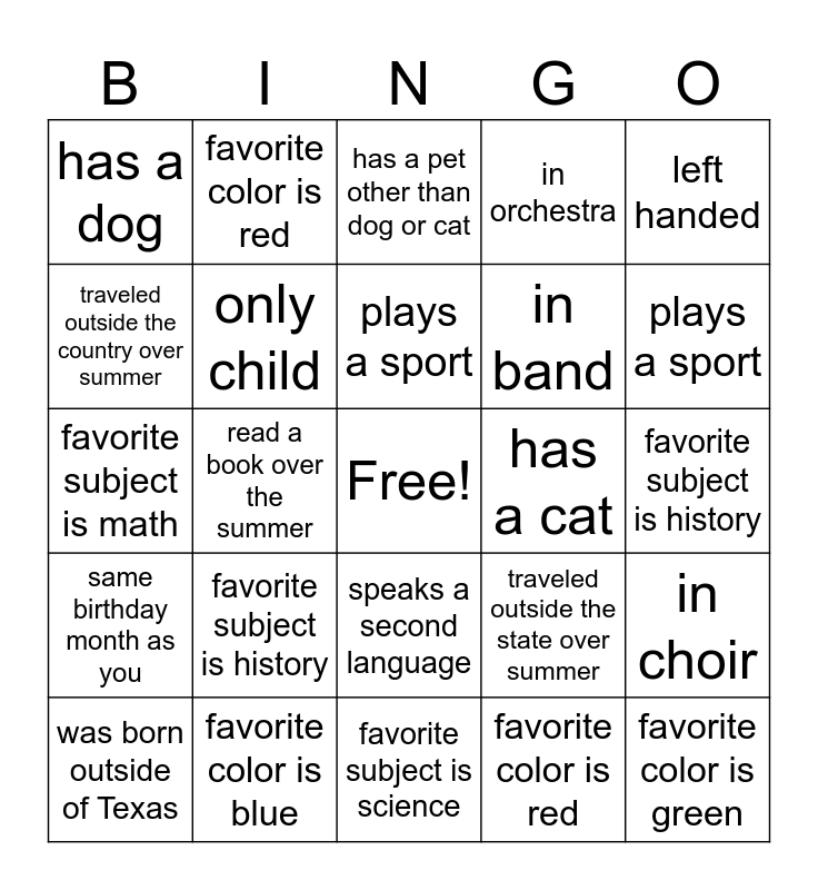 This bingo card has a free space and 24 words: favorite subject is history, favorite color is blue, plays a sport, was born outside of Texas, left handed, has a dog, traveled outside the country over summer, favorite color is red, has a cat, speaks a second language, in band, favorite subject is math, traveled outside the state over summer, in choir, only child, favorite color is red, favorite subject is history, has a pet other than dog or cat, plays a sport, read a book over the summer, favorite color is green, same birthday month as you, in orchestra and favorite subject is science.