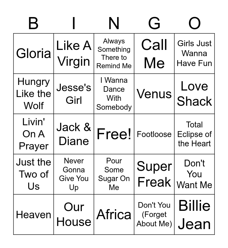 This bingo card has a free space and 50 words: Let's Go Crazy, Billie Jean, Take On Me, Africa, Never Gonna Give You Up, Everybody Wants to Rule the World, Like A Virgin, Sweet Dreams (Are Made of This), Hungry Like the Wolf, Eye of the Tiger, Jesse's Girl, Call Me, Don't You Want Me, Super Freak, Love is a Battlefield, Walking on Sunshine, I Wanna Dance With Somebody, Footloose, Ghostbusters, Girls Just Wanna Have Fun, Jack & Diane, Don't You (Forget About Me), Gloria, Venus, Dancing With Myself, Down Under, Love Shack, Wake Me Up Before You Go-Go, Always Something There to Remind Me, Pour Some Sugar On Me, Whip It, Manic Monday, Come On Eileen, Tainted Love, Our House, Working for the Weekend, 867-5309/Jenny, Walk Like an Egyptian, I Still Haven't Found What I'm Looking For, Total Eclipse of the Heart, In the Air Tonight, Purple Rain, Keep On Loving You, I Want Candy, Heaven, Livin' On A Prayer, Welcome to the Jungle, Let's Hear It for the Boy, Just the Two of Us and Hold On Loosely.