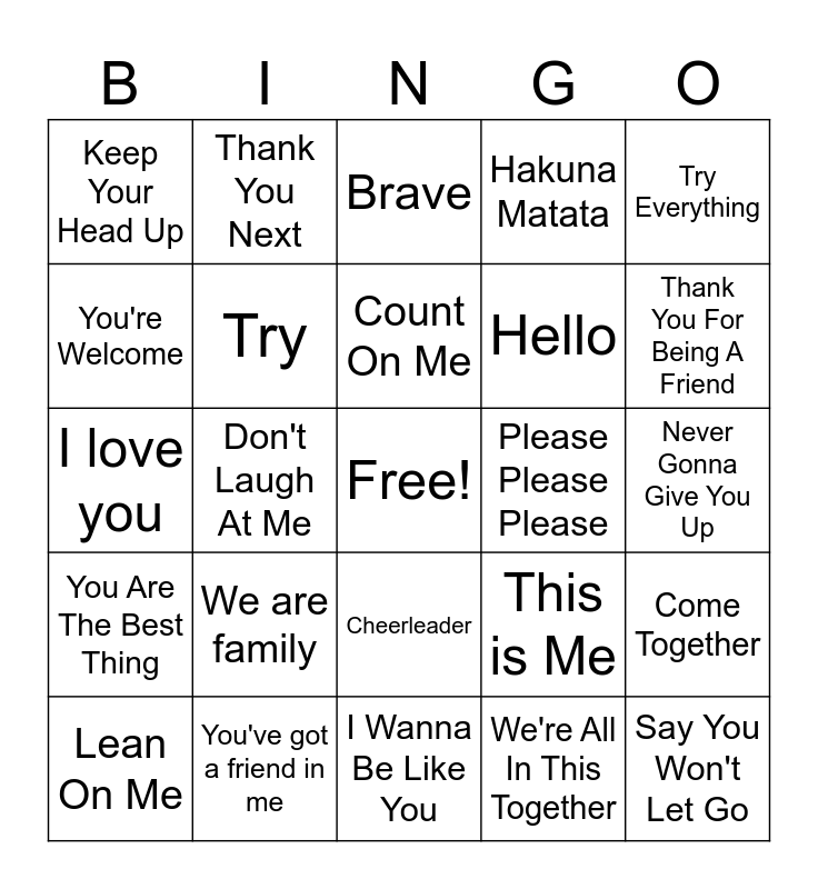 This bingo card has a free space and 24 words: We are family, You've got a friend in me, Count On Me, Lean On Me, Try Everything, Keep Your Head Up, You're Welcome, Thank You Next, Please Please Please, Cheerleader, Hello, I love you, This is Me, Come Together, Try, We're All In This Together, Never Gonna Give You Up, Brave, Thank You For Being A Friend, Don't Laugh At Me, Say You Won't Let Go, You Are The Best Thing, Hakuna Matata and I Wanna Be Like You.