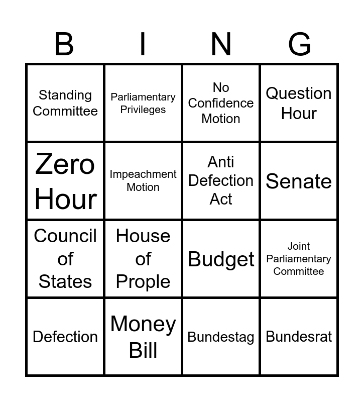 This bingo card has 16 words: Defection, Money Bill, No Confidence Motion, Question Hour, Zero Hour, Parliamentary Privileges, Budget, Joint Parliamentary Committee, Standing Committee, Impeachment Motion, Bundestag, Senate, Council of States, House of Prople, Anti Defection Act and Bundesrat.