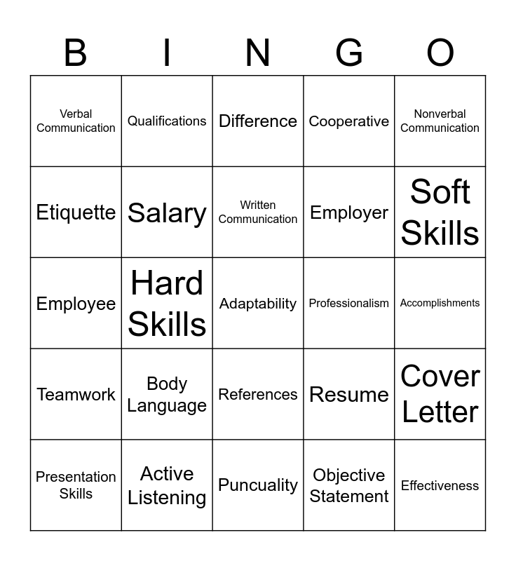 This bingo card has a free space and 24 words: Body Language, Active Listening, Written Communication, Presentation Skills, Nonverbal Communication, Verbal Communication, Etiquette, Qualifications, Professionalism, References, Employer, Employee, Resume, Cover Letter, Salary, Objective Statement, Accomplishments, Difference, Soft Skills, Hard Skills, Effectiveness, Teamwork, Cooperative and Puncuality.