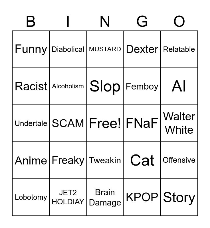 This bingo card has a free space and 24 words: Freaky, JET2 HOLDIAY, Slop, Lobotomy, Relatable, Funny, Racist, Diabolical, FNaF, Tweakin, Femboy, Undertale, Cat, Offensive, Alcoholism, KPOP, Walter White, MUSTARD, AI, SCAM, Story, Anime, Dexter and Brain Damage.