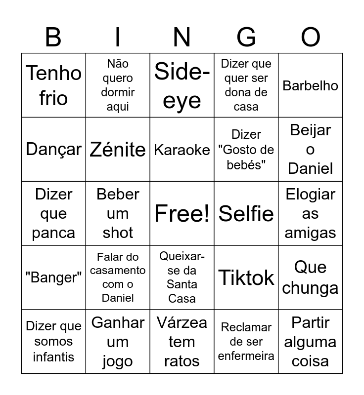 This bingo card has a free space and 24 words: Falar do casamento com o Daniel, Ganhar um jogo, Karaoke, Dizer que somos infantis, Barbelho, Tenho frio, Dançar, Não quero dormir aqui, Selfie, Queixar-se da Santa Casa, Dizer "Gosto de bebés", Dizer que panca, Tiktok, Que chunga, Zénite, Reclamar de ser enfermeira, Elogiar as amigas, Side-eye, Beijar o Daniel, Beber um shot, Partir alguma coisa, "Banger", Dizer que quer ser dona de casa and Várzea tem ratos.