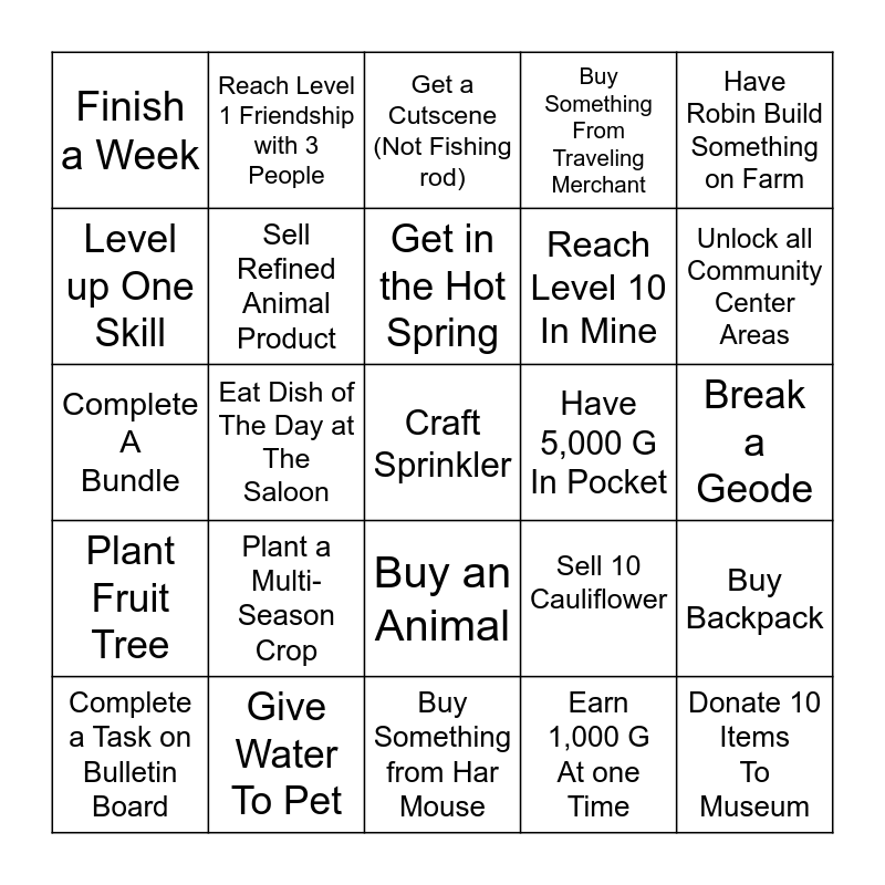 This bingo card has 25 words: Plant a Multi-Season Crop, Buy Something from Har Mouse, Get in the Hot Spring, Complete a Task on Bulletin Board, Have Robin Build Something on Farm, Finish a Week, Level up One Skill, Reach Level 1 Friendship with 3 People, Have 5,000 G In Pocket, Buy an Animal, Reach Level 10 In Mine, Complete A Bundle, Sell 10 Cauliflower, Buy Backpack, Sell Refined Animal Product, Donate 10 Items To Museum, Break a Geode, Get a Cutscene (Not Fishing rod), Unlock all Community Center Areas, Eat Dish of The Day at The Saloon, Craft Sprinkler, Give Water To Pet, Plant Fruit Tree, Buy Something From Traveling Merchant and Earn 1,000 G At one Time.