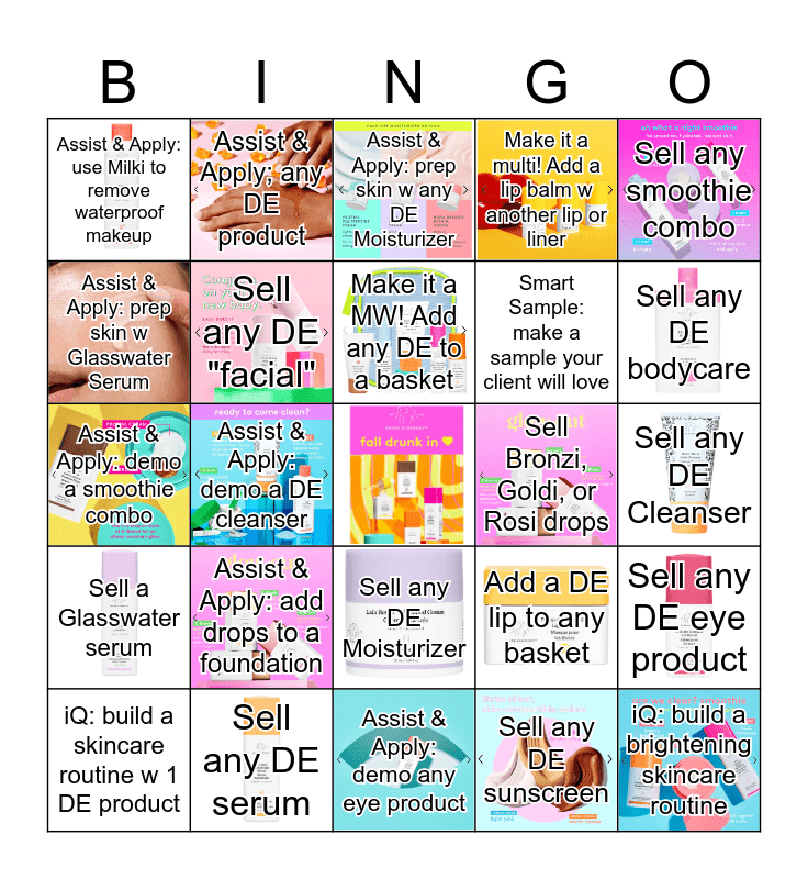 This bingo card has 22 images, a free space and 24 words: Assist & Apply: add drops to a foundation, Sell any DE serum, Make it a MW! Add any DE to a basket, iQ: build a skincare routine w 1 DE product, Sell any smoothie combo, Assist & Apply: use Milki to remove waterproof makeup, Assist & Apply: prep skin w Glasswater Serum, Assist & Apply; any DE product, Sell Bronzi, Goldi, or Rosi drops, Sell any DE Moisturizer, Smart Sample: make a sample your client will love, Assist & Apply: demo a smoothie combo, Add a DE lip to any basket, Sell any DE eye product, Sell any DE "facial", Sell any DE sunscreen, Sell any DE Cleanser, Assist & Apply: prep skin w any DE Moisturizer, Sell any DE bodycare, Assist & Apply: demo a DE cleanser, iQ: build a brightening skincare routine, Sell a Glasswater serum, Make it a multi! Add a lip balm w another lip or liner and Assist & Apply: demo any eye product.