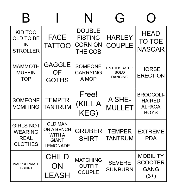 This bingo card has a free space and 24 words: OLD MAN ON A BENCH WITH A GIANT LEMONADE, CHILD ON LEASH, SOMEONE CARRYING A MOP, INAPPROPRIATE T-SHIRT, HEAD TO TOE NASCAR, KID TOO OLD TO BE IN STROLLER, MAMMOTH MUFFIN TOP, FACE TATTOO, A SHE-MULLET, GRUBER SHIRT, ENTHUSIASTIC SOLO DANCING, SOMEONE VOMITING, TEMPER TANTRUM, EXTREME PDA, GAGGLE OF GOTHS, SEVERE SUNBURN, BROCCOLI-HAIRED ALPACA BOYS, DOUBLE FISTING CORN ON THE COB, HORSE ERECTION, TEMPER TANTRUM, MOBILITY SCOOTER GANG (3+), GIRLS NOT WEARING REAL CLOTHES, HARLEY COUPLE and MATCHING OUTFIT COUPLE.