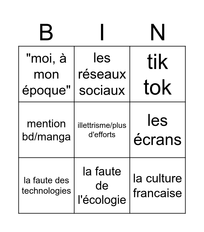 This bingo card has a free space and 8 words: les écrans, tik tok, les réseaux sociaux, la faute des technologies, "moi, à mon époque", la culture francaise, mention bd/manga and la faute de l'écologie.