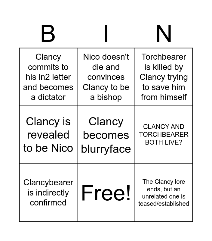 This bingo card has a free space and 9 words: Clancybearer is indirectly confirmed, Torchbearer is killed by Clancy trying to save him from himself, Nico doesn't die and convinces Clancy to be a bishop, Clancy is revealed to be Nico, Clancy commits to his ln2 letter and becomes a dictator, CLANCY AND TORCHBEARER BOTH LIVE?, The Clancy lore ends, but an unrelated one is teased/established, Clancy covering his eyes w/the stole happens in an MV and Free!.
