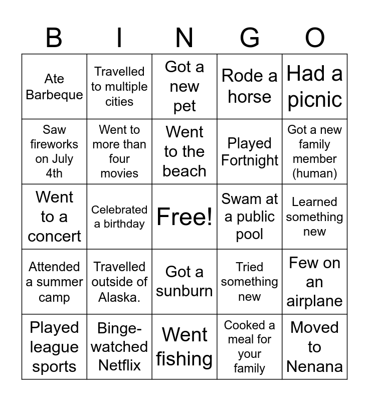 This bingo card has a free space and 24 words: Travelled outside of Alaska., Binge-watched Netflix, Went to the beach, Played league sports, Had a picnic, Ate Barbeque, Saw fireworks on July 4th, Travelled to multiple cities, Swam at a public pool, Got a sunburn, Played Fortnight, Went to a concert, Tried something new, Few on an airplane, Went to more than four movies, Cooked a meal for your family, Learned something new, Got a new pet, Got a new family member (human), Celebrated a birthday, Moved to Nenana, Attended a summer camp, Rode a horse and Went fishing.