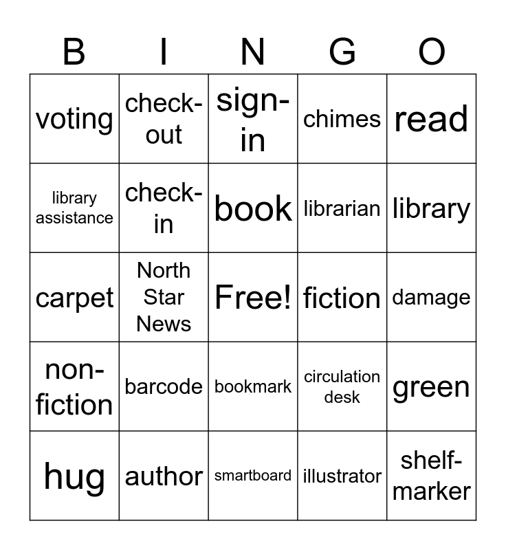 This bingo card has a free space and 24 words: barcode, author, book, hug, read, voting, library assistance, check-out, fiction, bookmark, librarian, carpet, circulation desk, green, check-in, illustrator, damage, sign-in, library, North Star News, shelf-marker, non-fiction, chimes and smartboard.