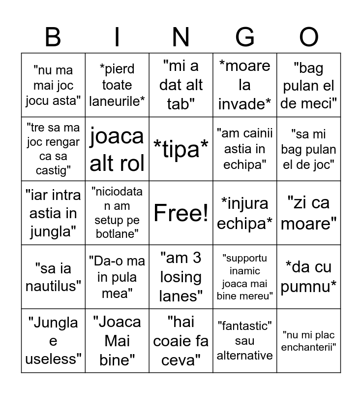 This bingo card has a free space and 24 words: "Da-o ma in pula mea", "Joaca Mai bine", *tipa*, "Jungla e useless", "bag pulan el de meci", "nu ma mai joc jocu asta", "tre sa ma joc rengar ca sa castig", *pierd toate laneurile*, *injura echipa*, "am 3 losing lanes", "am cainii astia in echipa", "iar intra astia in jungla", "supportu inamic joaca mai bine mereu", *da cu pumnu*, joaca alt rol, "fantastic" sau alternative, "zi ca moare", "mi a dat alt tab", "sa mi bag pulan el de joc", "niciodata n am setup pe botlane", "nu mi plac enchanterii", "sa ia nautilus", *moare la invade* and "hai coaie fa ceva".