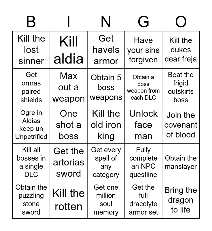 This bingo card has 25 words: Kill all bosses in a single DLC, Kill the rotten, Kill the old iron king, Get the full dracolyte armor set, Kill the dukes dear freja, Kill the lost sinner, Kill aldia, Get havels armor, Unlock face man, Obtain the manslayer, Get ormas paired shields, Max out a weapon, Get one million soul memory, Fully complete an NPC questline, Beat the frigid outskirts boss, Obtain the puzzling stone sword, One shot a boss, Obtain 5 boss weapons, Obtain a boss weapon from each DLC, Join the covenant of blood, Ogre in Aldias keep un Unpetrified, Get the artorias sword, Get every spell of any category, Have your sins forgiven and Bring the dragon to life.