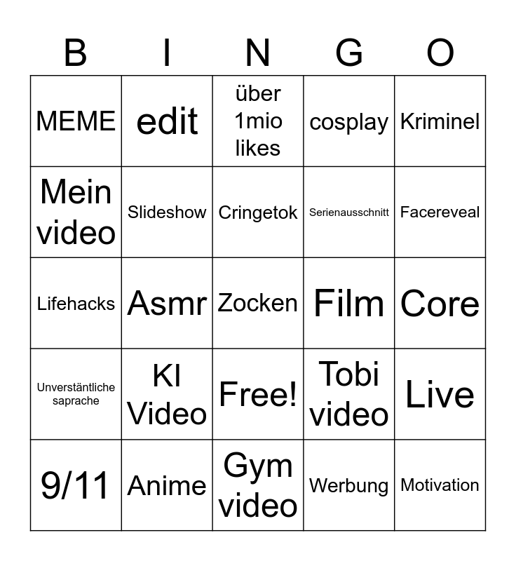 This bingo card has a free space and 24 words: KI Video, Anime, Cringetok, 9/11, Kriminel, MEME, Mein video, edit, Film, Free!, Serienausschnitt, Lifehacks, Tobi video, Live, Slideshow, Werbung, Core, über 1mio likes, Facereveal, Asmr, Motivation, Unverstäntliche saprache, cosplay and Gym video.