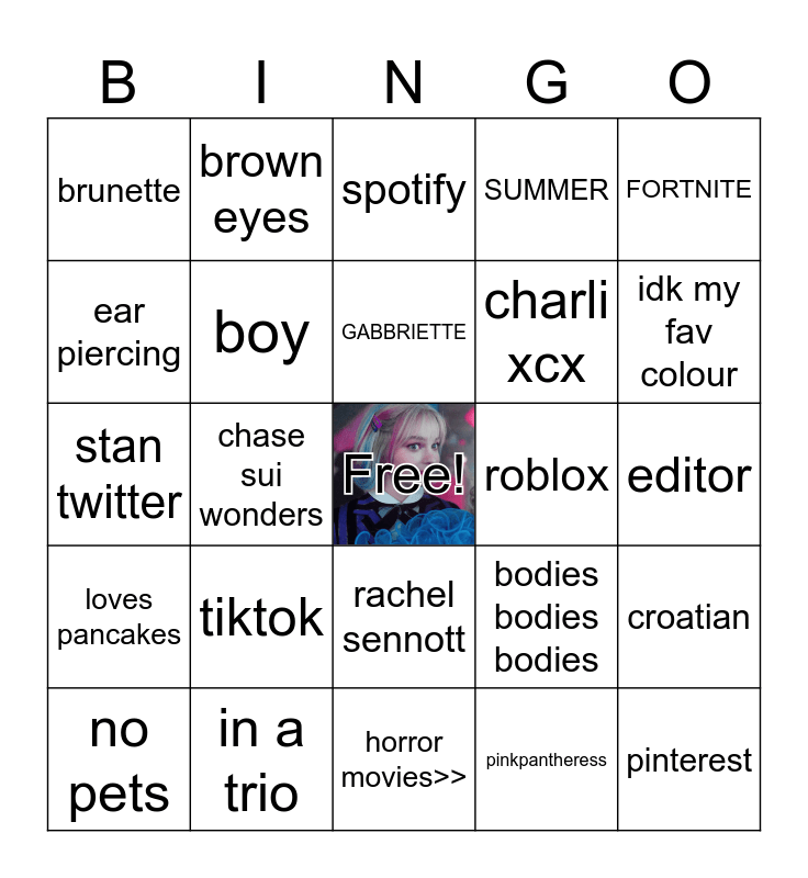 This bingo card has a free space and 24 words: tiktok, in a trio, GABBRIETTE, no pets, FORTNITE, brunette, ear piercing, brown eyes, roblox, rachel sennott, charli xcx, stan twitter, bodies bodies bodies, croatian, boy, pinkpantheress, editor, spotify, idk my fav colour, chase sui wonders, pinterest, loves pancakes, SUMMER and horror movies>>.