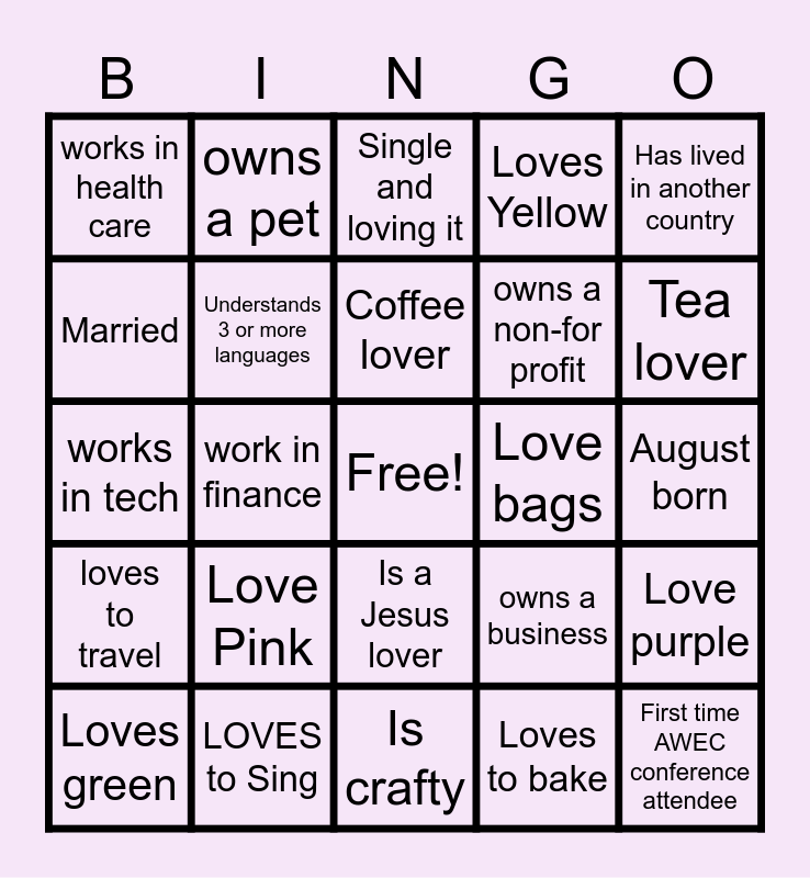 This bingo card has a free space and 24 words: Love Pink, LOVES to Sing, Coffee lover, Loves green, Has lived in another country, works in health care, Married, owns a pet, Love bags, Is a Jesus lover, owns a non-for profit, works in tech, owns a business, Love purple, Understands 3 or more languages, Loves to bake, August born, Single and loving it, Tea lover, work in finance, First time AWEC conference attendee, loves to travel, Loves Yellow and Is crafty.