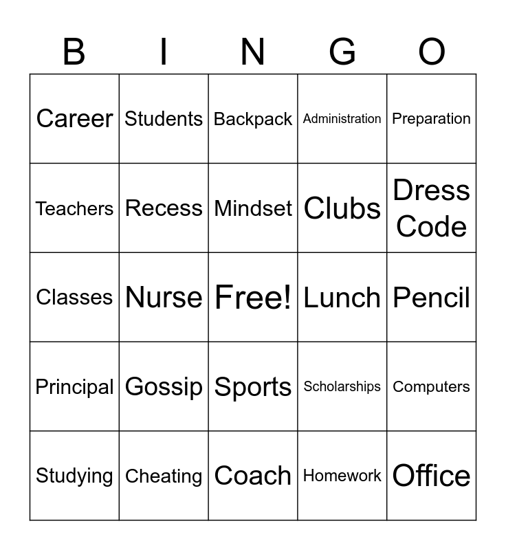 This bingo card has a free space and 24 words: Gossip, Cheating, Mindset, Studying, Preparation, Career, Teachers, Students, Lunch, Sports, Clubs, Classes, Scholarships, Computers, Recess, Homework, Pencil, Backpack, Dress Code, Nurse, Office, Principal, Administration and Coach.
