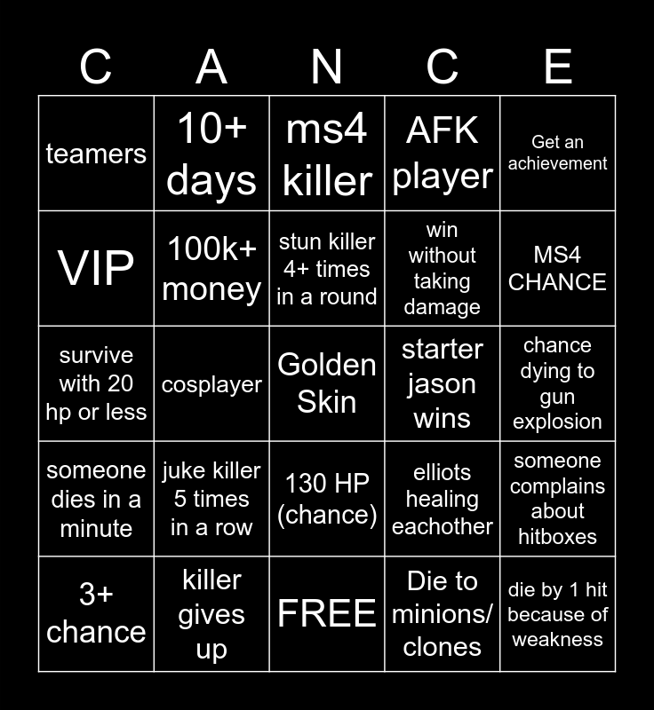 This bingo card has a free space and 34 words: Pro Jason, Die to minions/ clones, 4 ppl chilling in the same spot, Win as Noob, someone dies in a minute, 100k+ money, Get an achievement, 3+ chance, 10+ days, 5 success coin flip in a row, stun killer 4+ times in a round, ms4 killer, 3 or more shedletskys, Someone complains about hitboxes, starter jason wins, MS4 CHANCE, killer gives up, survive with 20 hp or less, juke killer 5 times in a row, elliots healing eachother, 130 HP (chance), MS4 NOOB, teamers, chance dying to gun explosion, FREE, die by 1 hit because of weakness, AFK player, No one dies, win without taking damage, VIP, FREE, cosplayer, someone complains about hitboxes and 20+ malice.