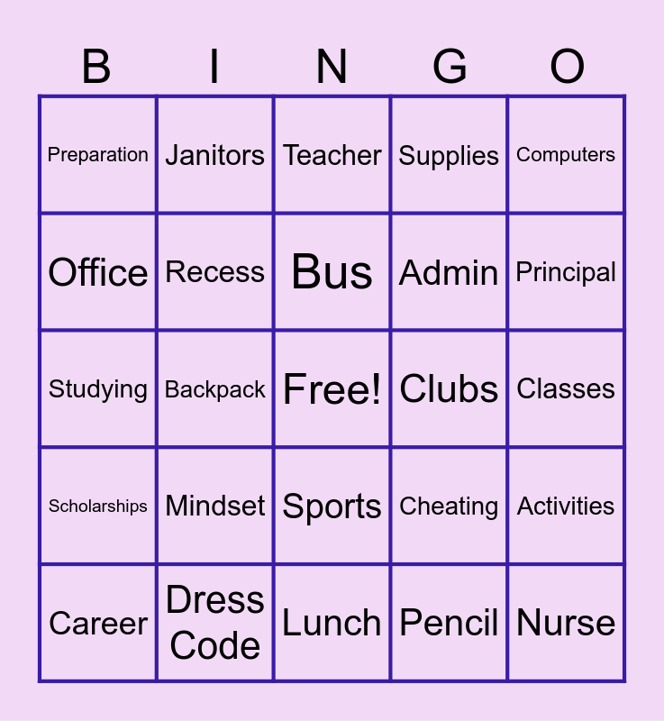 This bingo card has a free space and 29 words: Career, Students, Backpack, Homework, Preparation, Teacher, Recess, Mindset, Clubs, Dress Code, Classes, Nurse, Lunch, Pencil, Principal, Gossip, Sports, Scholarships, Computers, Studying, Cheating, Coach, Admin, Office, Supplies, Janitors, Activities, Bus and Field Trips.