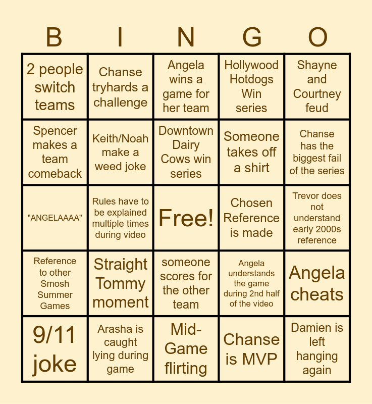 This bingo card has a free space and 36 words: Arasha eats a hotdog, Amanda somehow wins a point, spencer makes an inappropriate joke/comment, Keith/Noah make a weed joke, Angela understands the game during 2nd half of the video, Reference to other Smosh Summer Games, Downtown Dairy Cows win series, Someone makes a “Where’s ______” joke, Shayne and Courtney feud, Straight Chanse moment, Rules have to be explained multiple times during video, Hollywood Hotdogs Win series, Ian brings up a high school memory, Chosen Reference is made, Chanse has the biggest fail of the series, 2 people switch teams, Olivia wins MVP, Straight Tommy moment, Damien is left hanging again, Angela wins a game for her team, Trevor does not understand early 2000s reference, Angela cheats, Arasha is caught lying during game, 9/11 joke, Mid-Game flirting, Chanse tryhards a challenge, "ANGELAAAA", Someone comments on Tommy's muscles, Someone takes off a shirt, Spencer makes a team comeback, Spencer makes a gooner joke, Spencer wins MVP, Chanse is MVP, someone scores for the other team, Ian trickshots and Angela breaks character to say something wholesome.