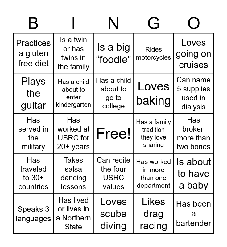 This bingo card has a free space and 24 words: Takes salsa dancing lessons, Has lived or lives in a Northern State, Has a child about to go to college, Speaks 3 languages, Loves going on cruises, Practices a gluten free diet, Plays the guitar, Is a twin or has twins in the family, Has a family tradition they love sharing, Can recite the four USRC values, Loves baking, Has served in the military, Has worked in more than one department, Is about to have a baby, Has a child about to enter kindergarten, Likes drag racing, Has broken more than two bones, Is a big “foodie”, Can name 5 supplies used in dialysis, Has worked at USRC for 20+ years, Has been a bartender, Has traveled to 30+ countries, Rides motorcycles and Loves scuba diving.