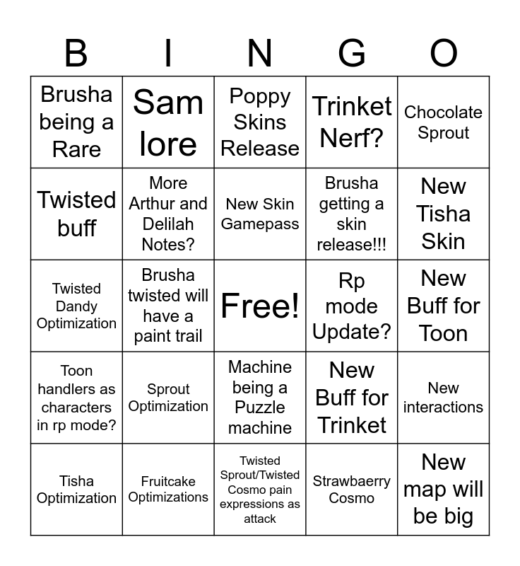This bingo card has a free space and 24 words: Sprout Optimization, Fruitcake Optimizations, New Skin Gamepass, Tisha Optimization, Chocolate Sprout, Brusha being a Rare, Twisted buff, Sam lore, Rp mode Update?, Machine being a Puzzle machine, Brusha getting a skin release!!!, Twisted Dandy Optimization, New Buff for Trinket, New interactions, More Arthur and Delilah Notes?, Strawbaerry Cosmo, New Buff for Toon, Poppy Skins Release, New Tisha Skin, Brusha twisted will have a paint trail, New map will be big, Toon handlers as characters in rp mode?, Trinket Nerf? and Twisted Sprout/Twisted Cosmo pain expressions as attack.