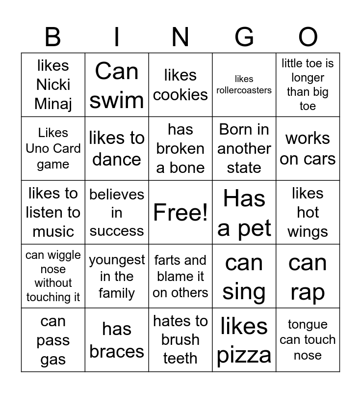 This bingo card has a free space and 24 words: youngest in the family, has braces, has broken a bone, can pass gas, little toe is longer than big toe, likes Nicki Minaj, Likes Uno Card game, Can swim, Has a pet, farts and blame it on others, Born in another state, likes to listen to music, can sing, can rap, likes to dance, likes pizza, likes hot wings, likes cookies, works on cars, believes in success, tongue can touch nose, can wiggle nose without touching it, likes rollercoasters and hates to brush teeth.