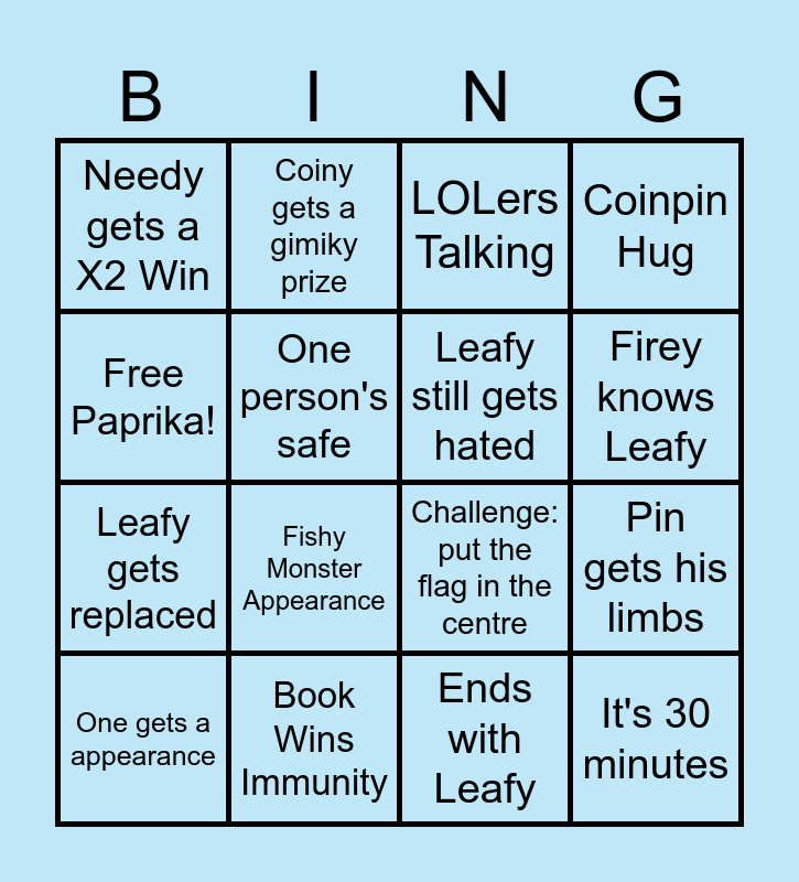 This bingo card has 16 words: Book Wins Immunity, Pin gets his limbs, LOLers Talking, Needy gets a X2 Win, Leafy gets replaced, Coiny gets a gimiky prize, Challenge: put the flag in the centre, Ends with Leafy, Free Paprika!, One person's safe, One gets a appearance, Coinpin Hug, Fishy Monster Appearance, Firey knows Leafy, Leafy still gets hated and It's 30 minutes.