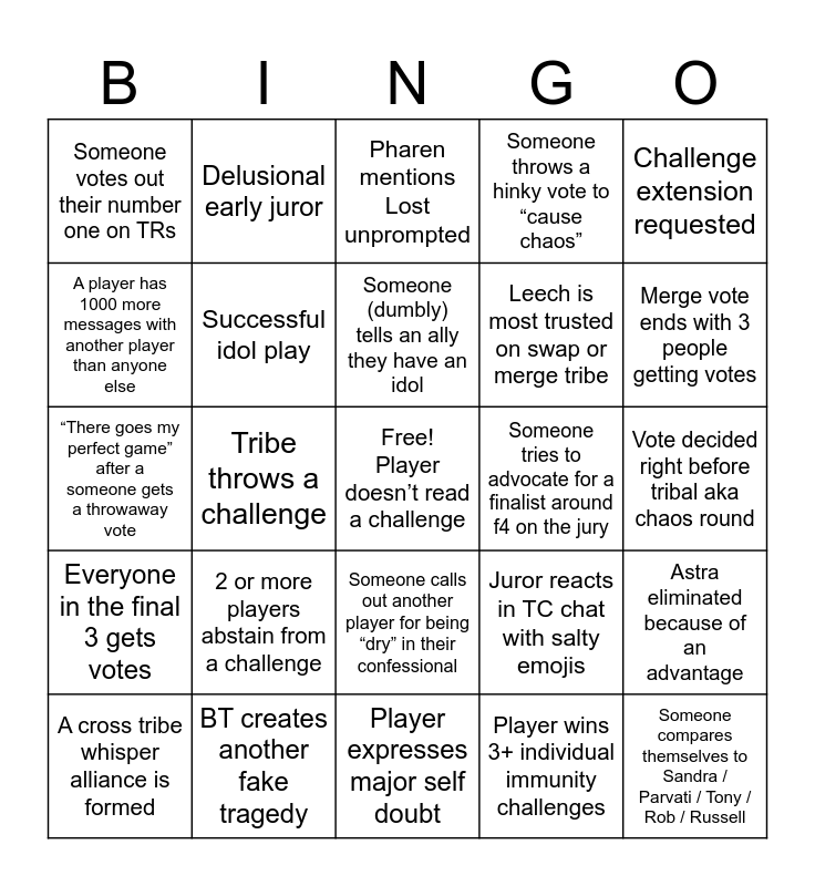 This bingo card has a free space and 24 words: 2 or more players abstain from a challenge, BT creates another fake tragedy, Someone (dumbly) tells an ally they have an idol, A cross tribe whisper alliance is formed, Challenge extension requested, Someone votes out their number one on TRs, A player has 1000 more messages with another player than anyone else, Delusional early juror, Someone tries to advocate for a finalist around f4 on the jury, Someone calls out another player for being “dry” in their confessional, Leech is most trusted on swap or merge tribe, “There goes my perfect game” after a someone gets a throwaway vote, Juror reacts in TC chat with salty emojis, Astra eliminated because of an advantage, Successful idol play, Player wins 3+ individual immunity challenges, Vote decided right before tribal aka chaos round, Pharen mentions Lost unprompted, Merge vote ends with 3 people getting votes, Tribe throws a challenge, Someone compares themselves to Sandra / Parvati / Tony / Rob / Russell, Everyone in the final 3 gets votes, Someone throws a hinky vote to “cause chaos” and Player expresses major self doubt.