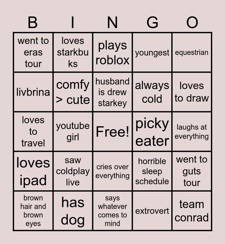 This bingo card has a free space and 24 words: saw coldplay live, has dog, husband is drew starkey, brown hair and brown eyes, equestrian, went to eras tour, livbrina, loves starkbu ks, picky eater, cries over everything, always cold, loves to travel, horrible sleep schedule, went to guts tour, comfy > cute, extrovert, laughs at everything, plays roblox, loves to draw, youtube girl, team conrad, loves ipad, youngest and says whatever comes to mind.