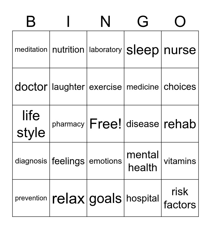 This bingo card has a free space and 28 words: vitamins, vaccine, medicine, hospital, doctor, laboratory, nutrition, diagnosis, disease, prevention, life style, sleep, relax, goals, choices, attitude, feelings, laughter, exercise, emotions, meditation, heredity, risk factors, pharmacy, rehab, mental health, nurse and physicals.