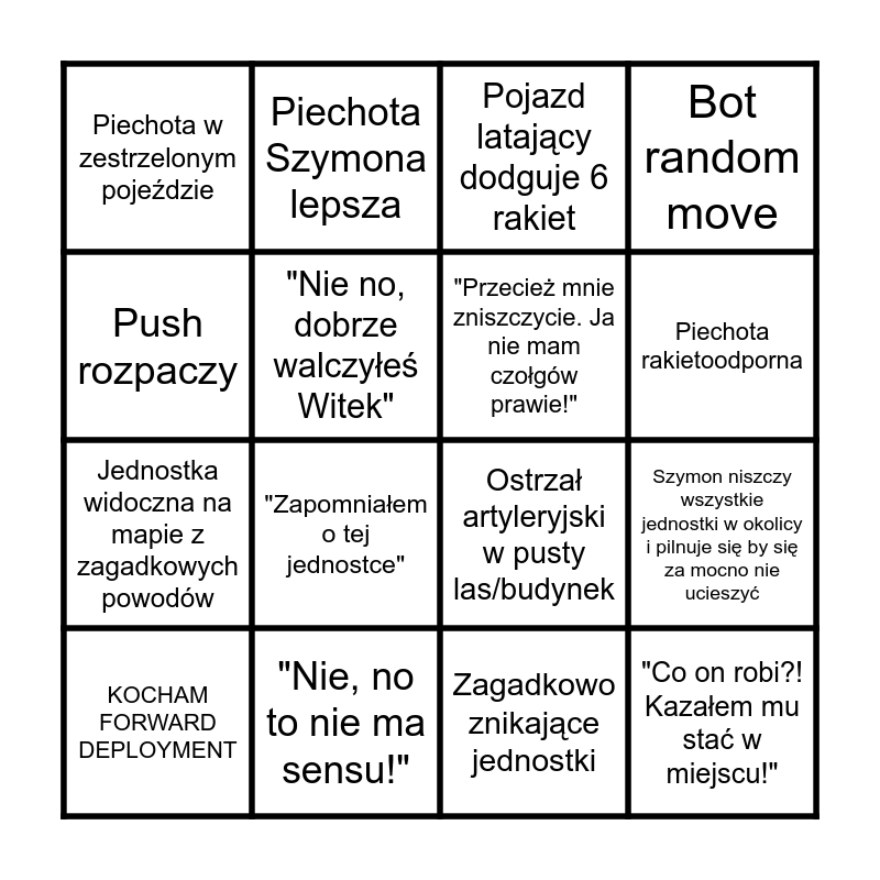 This bingo card has 16 words: "Nie, no to nie ma sensu!", Szymon niszczy wszystkie jednostki w okolicy i pilnuje się by się za mocno nie ucieszyć, Pojazd latający dodguje 6 rakiet, Piechota w zestrzelonym pojeździe, Jednostka widoczna na mapie z zagadkowych powodów, Piechota Szymona lepsza, Ostrzał artyleryjski w pusty las/budynek, Zagadkowo znikające jednostki, Push rozpaczy, "Nie no, dobrze walczyłeś Witek", KOCHAM FORWARD DEPLOYMENT, Bot random move, "Zapomniałem o tej jednostce", Piechota rakietoodporna, "Przecież mnie zniszczycie. Ja nie mam czołgów prawie!" and "Co on robi?! Kazałem mu stać w miejscu!".