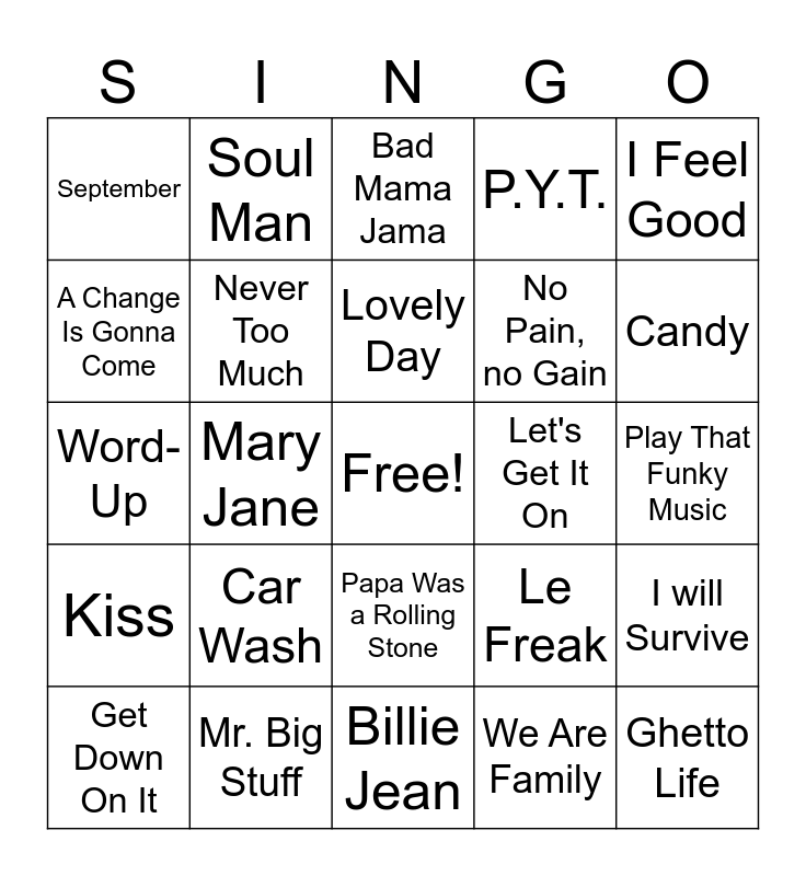 This bingo card has a free space and 24 words: Car Wash, Mr. Big Stuff, Lovely Day, Get Down On It, I Feel Good, September, A Change Is Gonna Come, Soul Man, Let's Get It On, Papa Was a Rolling Stone, No Pain, no Gain, Word-Up, Le Freak, I will Survive, Never Too Much, We Are Family, Play That Funky Music, Bad Mama Jama, Candy, Mary Jane, Ghetto Life, Kiss, P.Y.T. and Billie Jean.