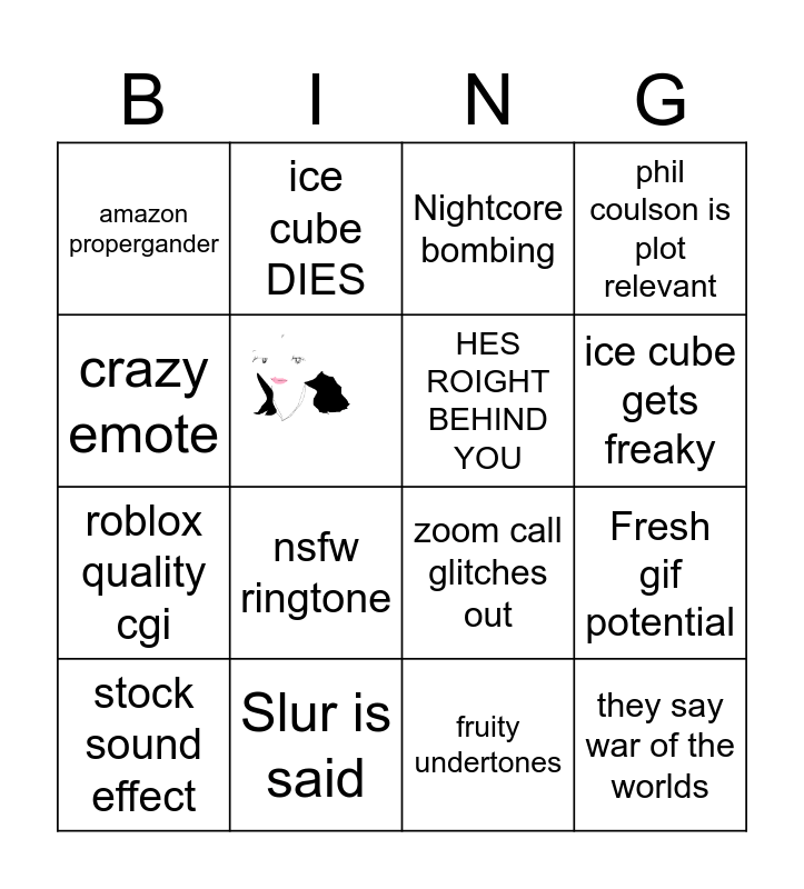 This bingo card has 1 images and 15 words: Slur is said, Fresh gif potential, Nightcore bombing, amazon propergander, roblox quality cgi, ice cube DIES, zoom call glitches out, fruity undertones, crazy emote, stock sound effect, phil coulson is plot relevant, nsfw ringtone, ice cube gets freaky, HES ROIGHT BEHIND YOU and they say war of the worlds.