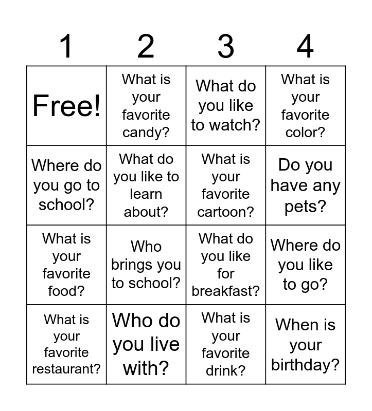 This bingo card has 16 words: What is your favorite restaurant?, Who do you live with?, What do you like to watch?, What is your favorite color?, Where do you go to school?, What is your favorite candy?, What do you like for breakfast?, Where do you like to go?, Free!, What do you like to learn about?, What is your favorite drink?, Do you have any pets?, What is your favorite food?, Who brings you to school?, What is your favorite cartoon? and When is your birthday?.