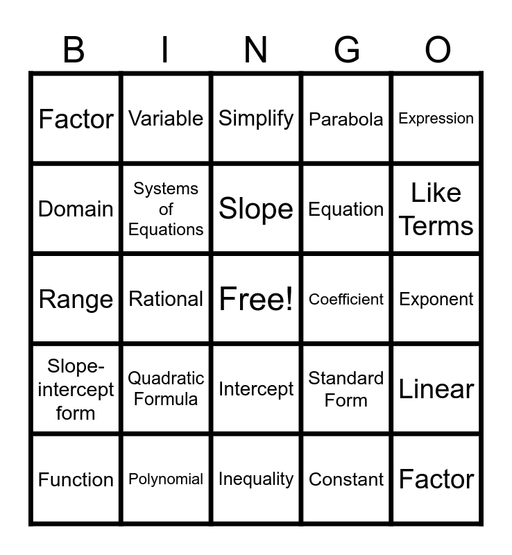 This bingo card has a free space and 24 words: Quadratic Formula, Polynomial, Slope, Function, Expression, Factor, Domain, Variable, Coefficient, Intercept, Equation, Range, Standard Form, Linear, Systems of Equations, Constant, Exponent, Simplify, Like Terms, Rational, Factor, Slope-intercept form, Parabola and Inequality.