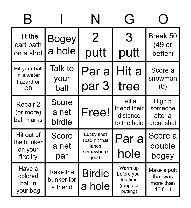 This bingo card has a free space and 30 words: Rake the bunker for a friend, 1 putt, Score a net birdie, On the green in regulation, Hit the cart path on a shot, 2 putt, Talk to your ball, Lucky shot (bad hit that lands somewhere good), Tell a friend their distance to the hole, Birdie a hole, High 5 someone after a great shot, Make a putt that was more than 10 feet, Warm up before your tee time (range or putting), Hit your ball in a bunker, Score a snowman (8), Score a hockey stick (7), Par a hole, Hit out of the bunker on your first try, Score a net par, Break 50 (49 or better), Repair 2 (or more) ball marks, Land in the fairway on your drive, Bogey a hole, Hit a tree, Hit your ball in a water hazard or OB, 3 putt, Score a double bogey, Have a colored ball in your bag, Par a par 3 and Bring birdie shots or water with you..
