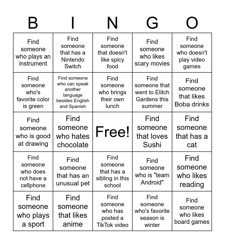 This bingo card has a free space and 24 words: Find someone that has an unusual pet, Find someone that likes anime, Find someone who brings their own lunch, Find someone who plays a sport, Find someone who doesn't play video games, Find someone who plays an instrument, Find someone who's favorite color is green, Find someone that has a Nintendo Switch, Find someone that loves Sushi, Find someone that has a sibling in this school, Find someone that went to Elitch Gardens this summer, Find someone who is good at drawing, Find someone who is "team Android", Find someone who likes reading, Find someone who can speak another language besides English and Spanish, Find someone who's favorite season is winter, Find someone that has a cat, Find someone that doesn't like spicy food, Find someone that likes Boba drinks, Find someone who hates chocolate, Find someone who likes board games, Find someone who does not have a cellphone, Find someone who likes scary movies and Find someone who has posted a TikTok video.
