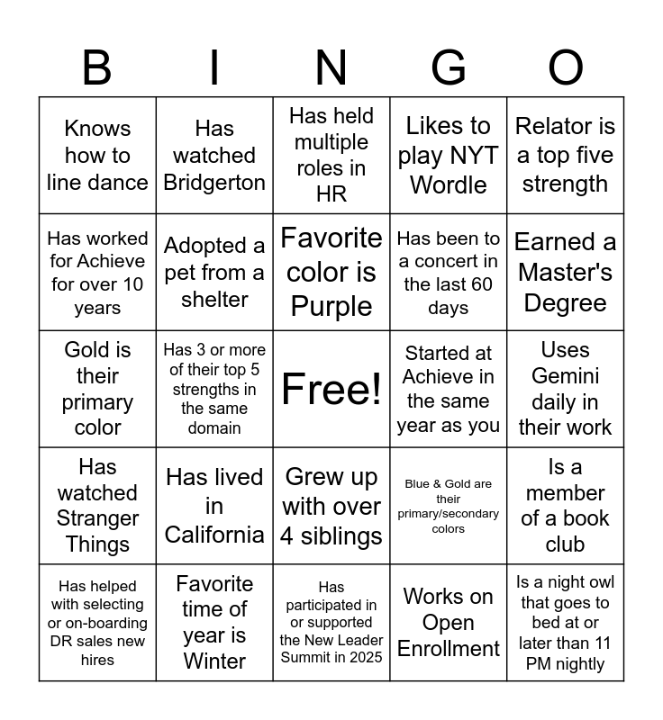 This bingo card has a free space and 106 words: Owns a black or grey cat, Competition is a top five strength, Relator is a top five strength, Practices a Vegetarian or Vegan diet, Someone whose role supports Lending, Someone whose role supports DR, Someone whose role supports Shared Services, Someone whose role supports Technology, Blue is their primary color, Green is their primary color, Has worked for Achieve for 5 years or more, Has worked for Achieve for less than one year, Has worked in another department besides HR, Has a birthday in August, Has a birthday in July, Has an anniversary coming up in September, Has held multiple roles in HR, Performed work supporting the Engagement Survey, Has done work supporting Elevate, Born in another country, Grew up with over 4 siblings, Has more than 2 dogs, Is a "boy mom", Is a "girl dad", Has traveled to more than three countries, Has lived in California, Earned a Master's Degree, Likes to play NYT Wordle, Someone whose first and last initials are the same letter, Has Orange & Green as their primary/secondary colors, Blue & Gold are their primary/secondary colors, Works on Open Enrollment, Strategic is a top five strength, Communication is a top five strength, Responsibility is a top five strength, Woo as a top five strength, Helped to develop a CBT (Computer Based Training), Participated in a volunteer event in the last quarter, Favorite color is Purple, Favorite color is Green, Someone who was named after a family member or friend, Loves to cook from scratch, Has a Costco membership, Has watched Stranger Things, Loves Reality TV, Has worked for Achieve for over 10 years, Someone that speaks two or more languages, Knows how to line dance, Wakes up at 6 AM or earlier every day, Is a night owl that goes to bed at or later than 11 PM nightly, Favorite time of year is Fall, Favorite time of year is Winter, Plays a competitive sport, Has read three or more books in the last month, Born in the same month as you, Has a family special recipe, Has played Minecraft, Counts The Lord of the Rings as a favorite movie series, Dislikes horror movies, Has watched Bridgerton, Is a member of all ERG slack channels, Can do a vlookup in Excel, Is terrified of Public Speaking, Prefers mountains to beach vacations, Has traveled to Italy, Has visited a volcano, Has a pet that is not a cat or dog, Has visited NYC, Has been to a concert in the last 60 days, Gold is their primary color, Has 3 or more of their top 5 strengths in the same domain, Has participated in or supported the New Leader Summit in 2025, Has met a famous person, Has a new baby or will welcome a new baby in 2025, Is an Arizona native, Received DNA analysis from 23 & Me or related service, Has watched a Black & White movie in the last year, Has seen a play in the last 6 months, Donated blood in the last year, Ran a marathon, Is Left Handed, Likes to play board games, Prefers tea over coffee, Prefers sparkling water over still, Has a top 5 strength in all domains, Has Analytical as a top 5 strength, Started at Achieve in the same year as you, Practices Yoga, Loves to sing Karaoke, Is an only child or has an only child, Has met a celebrity, Has organized a work outing or team builder, Likes to go camping, Knows how to surf, Has a hobby that is competitive, Is a member of a book club, Has a favorite weekend getaway, Is a regular at a specific restaurant or bar, Used ChatGPT this week, Uses Gemini daily in their work, Adopted a pet from a shelter, Is a DJ, Goes by a nickname, Has won money on a lottery ticket, Has helped with selecting or on-boarding DR sales new hires and Has handled a "global transfer".