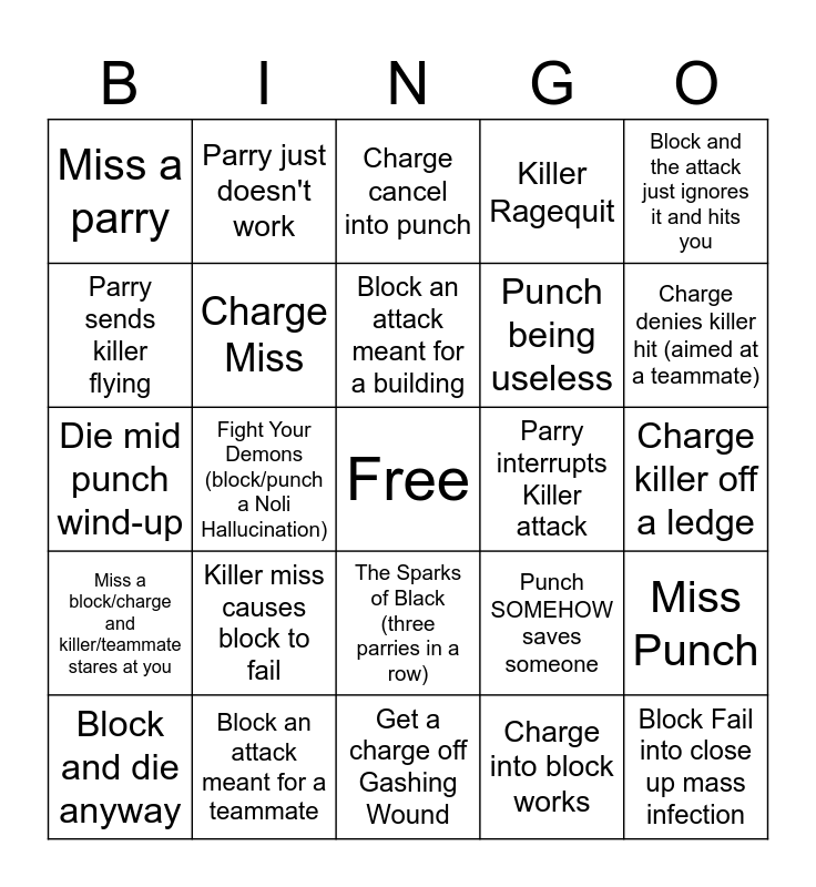 This bingo card has a free space and 24 words: Killer miss causes block to fail, Block an attack meant for a teammate, Block an attack meant for a building, Block and die anyway, Block and the attack just ignores it and hits you, Miss a parry, Parry sends killer flying, Parry just doesn't work, Parry interrupts Killer attack, The Sparks of Black (three parries in a row), Punch being useless, Die mid punch wind-up, Punch SOMEHOW saves someone, Miss Punch, Charge Miss, Charge into block works, Charge killer off a ledge, Charge cancel into punch, Charge denies killer hit (aimed at a teammate), Fight Your Demons (block/punch a Noli Hallucination), Block Fail into close up mass infection, Miss a block/charge and killer/teammate stares at you, Killer Ragequit and Get a charge off Gashing Wound.