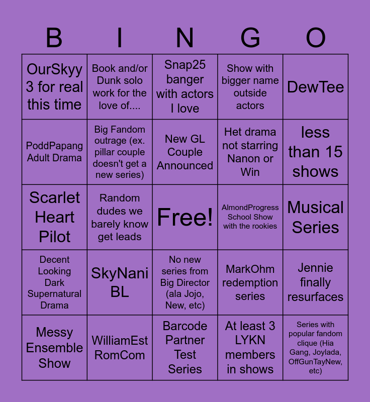 This bingo card has a free space and 24 words: SkyNani BL, WilliamEst RomCom, New GL Couple Announced, Messy Ensemble Show, DewTee, OurSkyy 3 for real this time, PoddPapang Adult Drama, Book and/or Dunk solo work for the love of...., AlmondProgress School Show with the rookies, No new series from Big Director (ala Jojo, New, etc), Het drama not starring Nanon or Win, Scarlet Heart Pilot, MarkOhm redemption series, Jennie finally resurfaces, Big Fandom outrage (ex. pillar couple doesn't get a new series), At least 3 LYKN members in shows, Musical Series, Snap25 banger with actors I love, less than 15 shows, Random dudes we barely know get leads, Series with popular fandom clique (Hia Gang, Joylada, OffGunTayNew, etc), Decent Looking Dark Supernatural Drama, Show with bigger name outside actors and Barcode Partner Test Series.