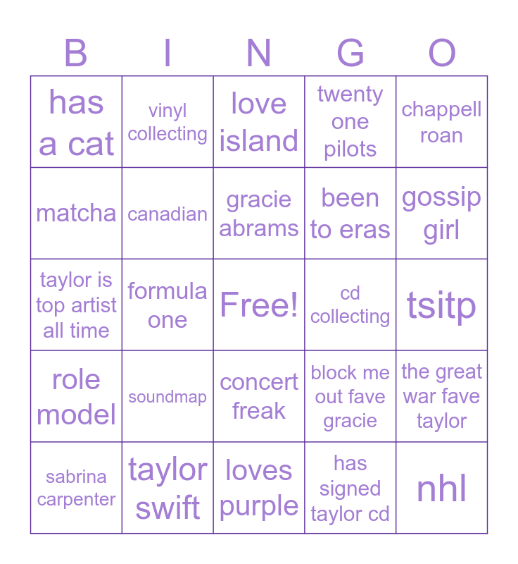 This bingo card has a free space and 24 words: soundmap, taylor swift, gracie abrams, sabrina carpenter, chappell roan, has a cat, matcha, vinyl collecting, cd collecting, concert freak, been to eras, taylor is top artist all time, block me out fave gracie, the great war fave taylor, canadian, has signed taylor cd, tsitp, love island, gossip girl, formula one, nhl, role model, twenty one pilots and loves purple.