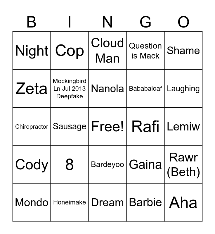 This bingo card has a free space and 64 words: Moon, Train, Judy, Barbie, Tamatoa, Bear, Cop, STX, Rafi, Title, Cody, G, Gaina, Shame, Zowenon, Mockingbird Ln Jul 2013 Deepfake, Nanola, Question is Mack, Cough, Zeta, Honeimake, Bardeyoo, Bababaloaf, Aha, Bonoboxing, Was, A, Hot, Lemiw, Mondo, Crying, Gaty, Sally, Buhihozelir, Chiropractor, Hot (again), Song, Silence, Aah, Night, Sausage, Dream, Look at Me, Gift, Christmas, 8, Sonic, 1-0, Laughing, Itchy, Monkey, Plug, O, Rawr (Beth), Title (again), Title (3rd time), Cloud Man, Snowflake, Problem, More, Whisper, Night (again), Dance and Dryo.
