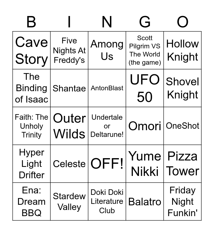 This bingo card has a free space and 24 words: Celeste, Stardew Valley, AntonBlast, Ena: Dream BBQ, Hollow Knight, Cave Story, The Binding of Isaac, Five Nights At Freddy's, Omori, OFF!, UFO 50, Faith: The Unholy Trinity, Yume Nikki, Pizza Tower, Shantae, Balatro, OneShot, Among Us, Shovel Knight, Outer Wilds, Friday Night Funkin', Hyper Light Drifter, Scott Pilgrim VS The World (the game) and Doki Doki Literature Club.