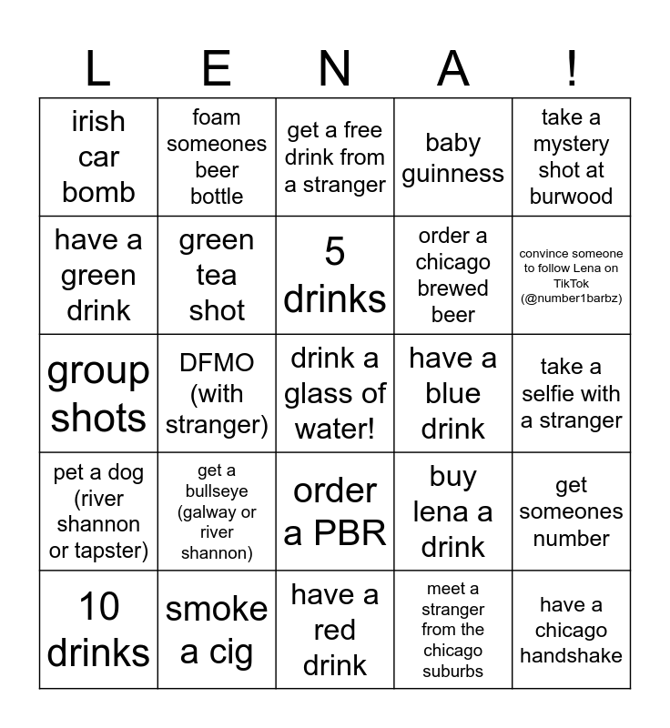 This bingo card has a free space and 24 words: get a bullseye (galway or river shannon), smoke a cig, 5 drinks, 10 drinks, take a mystery shot at burwood, irish car bomb, have a green drink, foam someones beer bottle, have a blue drink, order a PBR, order a chicago brewed beer, group shots, buy lena a drink, get someones number, green tea shot, meet a stranger from the chicago suburbs, take a selfie with a stranger, get a free drink from a stranger, convince someone to follow Lena on TikTok (@number1barbz), DFMO (with stranger), have a chicago handshake, pet a dog (river shannon or tapster), baby guinness and have a red drink.