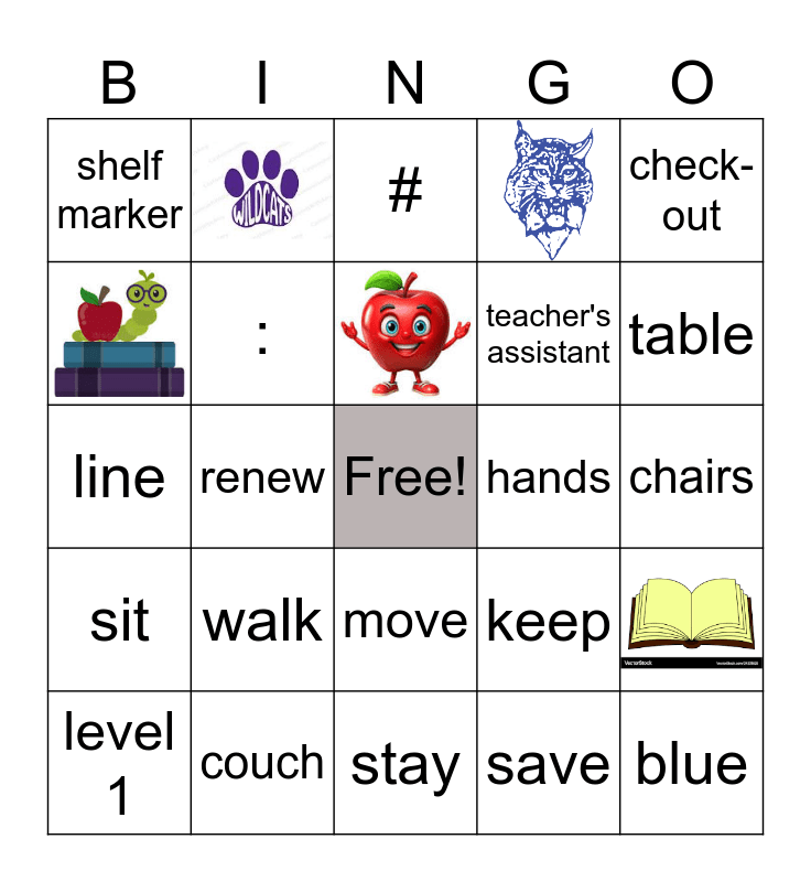This bingo card has 6 images, a free space and 23 words: level 1, level 0, renew, lost, shelf marker, #, :, walk, hands, couch, chairs, blue, stay, save, table, wheels, move, sit, check-out, line, keep, care and teacher's assistant.