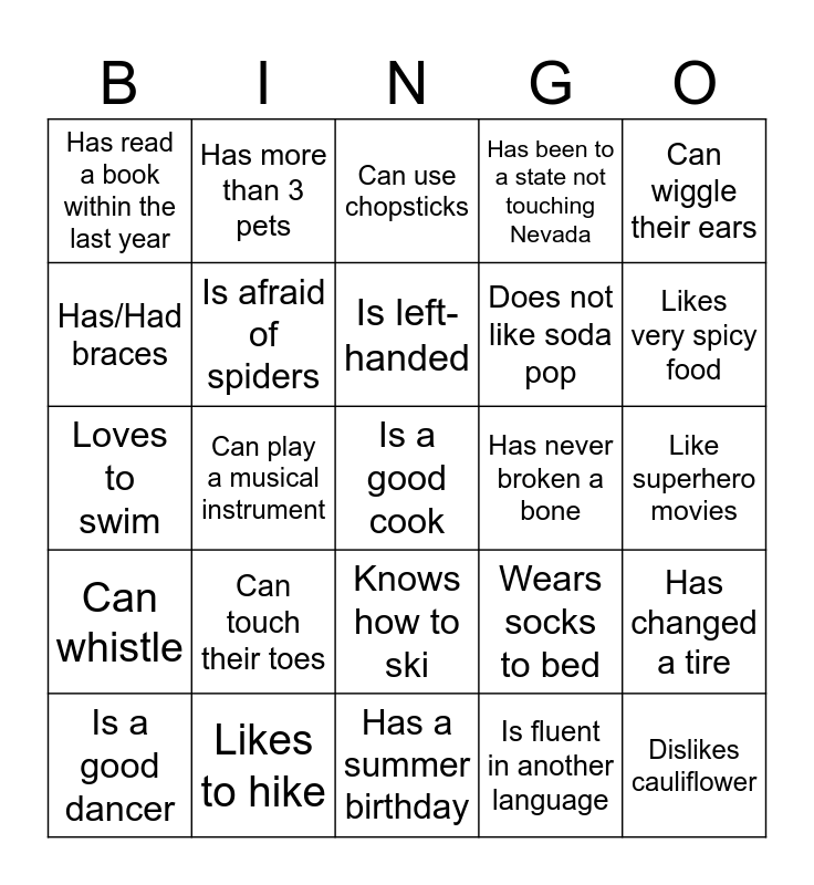 This bingo card has a free space and 24 words: Can touch their toes, Likes to hike, Is left-handed, Is a good dancer, Can wiggle their ears, Has read a book within the last year, Has/Had braces, Has more than 3 pets, Has never broken a bone, Knows how to ski, Does not like soda pop, Loves to swim, Wears socks to bed, Has changed a tire, Is afraid of spiders, Is fluent in another language, Like superhero movies, Can use chopsticks, Likes very spicy food, Can play a musical instrument, Dislikes cauliflower, Can whistle, Has been to a state not touching Nevada and Has a summer birthday.