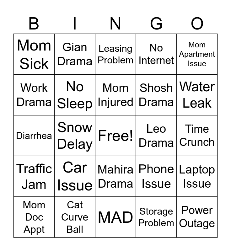 This bingo card has a free space and 24 words: Car Issue, Cat Curve Ball, Mom Injured, Mom Doc Appt, Mom Apartment Issue, Mom Sick, Work Drama, Gian Drama, Leo Drama, Mahira Drama, Shosh Drama, Diarrhea, Phone Issue, Laptop Issue, No Sleep, Storage Problem, Time Crunch, Leasing Problem, Water Leak, Snow Delay, Power Outage, Traffic Jam, No Internet and MAD.
