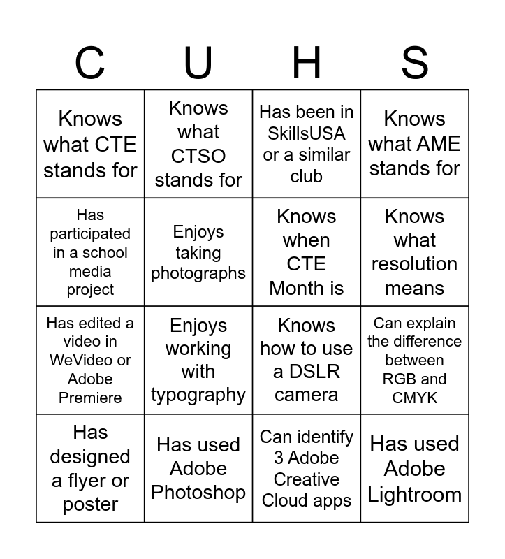 This bingo card has 16 words: Has used Adobe Photoshop, Can explain the difference between RGB and CMYK, Has been in SkillsUSA or a similar club, Knows what CTE stands for, Has edited a video in WeVideo or Adobe Premiere, Knows what CTSO stands for, Knows how to use a DSLR camera, Can identify 3 Adobe Creative Cloud apps, Has participated in a school media project, Enjoys taking photographs, Has designed a flyer or poster, Knows what AME stands for, Enjoys working with typography, Knows what resolution means, Knows when CTE Month is and Has used Adobe Lightroom.